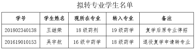 根据《伟德国际victor1946普通专科学生转专业管理办法(修改)》乐职院通[2019]49号文件精神,经学生自愿提出申请,转专业工作领导小组审批,拟同意以下同学转入药学专业学习(见下表),公示期为10月9日-11日。对拟转专业结果有异议者,请本人在公示期内将相关材料以书面形式报送到学院教务处,联系电话:0833-2273201。