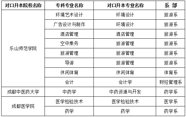 根据《四川省教育厅关于做好 2020 年普通高校专升本计划管理工作的通知》(川教函〔2020〕191号)文件精神, 现对已收到通知的三所院校:乐山师范学院、成都中医药大学、成都医学院开展2020年专升本的预报名工作: