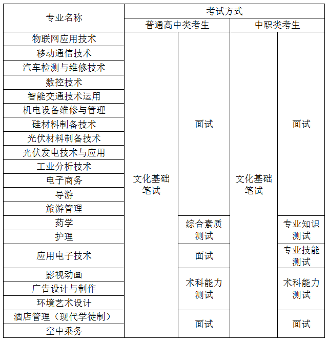 本次单独招生考试采用“文化基础笔试+测试”方式进行,总成绩满分为500分,其中“文化基础笔试”为300分,“测试”(分综合素质测试、专业知识测试、专业技能测试、术科能力测试和面试五种形式)为200分。考生的文化基础笔试成绩和测试成绩两项相加即为其总成绩。各专业具体考试方式安排见下表: