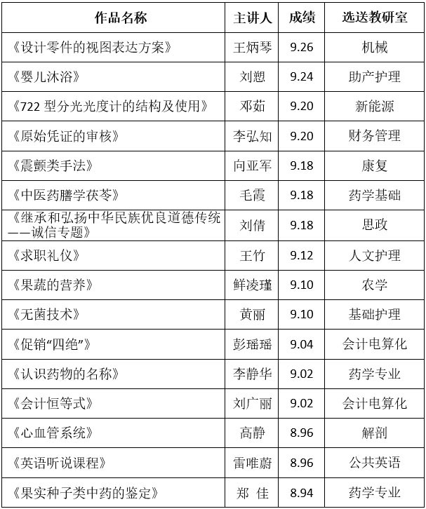 经大赛组委会研究,根据成绩排名,拟评定《设计零件的视图表达方案》等4件作品为一等奖,《震颤类手法》等4件作品为二等奖,《果蔬的营养》等8件作品为三等奖,《RNC数据配置》等11件作品为优秀奖。具体名单如下: