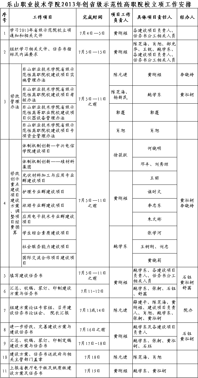 按照《四川省教育厅 四川省财政厅关于确定2013年度“省级示范性高等职业院校建设计划”立项建设院校的通知(川教函〔2013〕438号)》文件(见附件1)精神,根据7月5日上午召开的2013年“创示”领导小组工作会会议要求,结合蹇路书记、薛建平院长及相关院领导在会上的重要指示,现就2013年创示立项期间的工作作如下安排和要求: