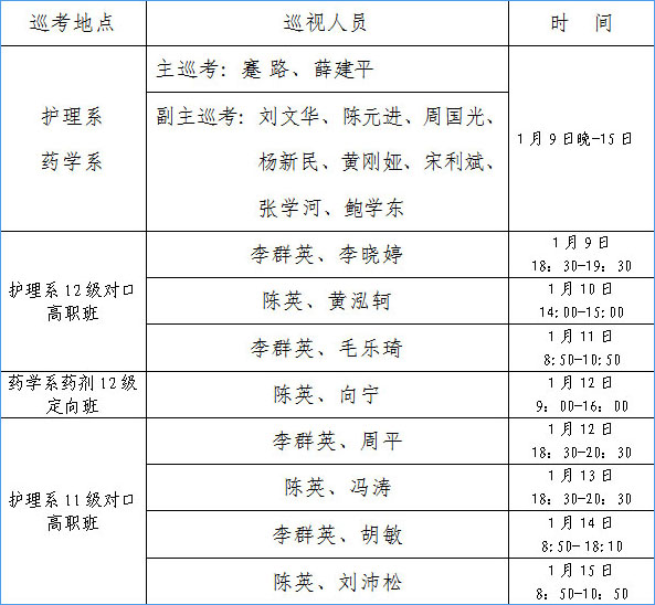 表2:护理系对口高职和药学系定向培养班期末考试巡考安排表