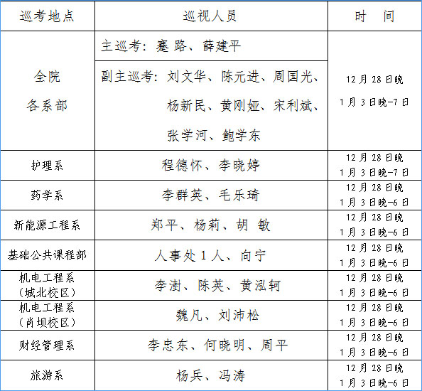 由学院书记、院长、分管教学工作的副院长、分管学生工作的副院长、督导处、教务处、监察审计处、学生工作部、人事处、各系(部)主任或书记等组成,进行交叉巡考。