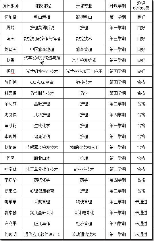 根据《伟德国际victor1946以能力为本位的项目化课程改革实施方案》(乐职院【2012】65号)文件精神,学院于2013年1月28-29日由常州工程职业技术学院专家对第一批21位进行项目化课程改革的教师进行了职业教育教学能力现场测评、2013年2月学院三大专业评委组对测评教师提交的材料进行了评审。经2月28日学院项目办领导小组会审核,现将综合测评结果公示如下: