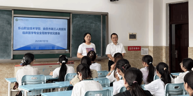 2025年7月7日, 为深化校院协同育人,自贡第三人民医院任勇副院长、医教科副科长龚晓玲等一行4人来我院开展2024级临床医学专业全程教学班见面会,医学学院负责人谯时文、医学学院党总支副书记李晓婷(主持党政工作)、党总支副书记伍静、学院副院长张慧等参加会议。