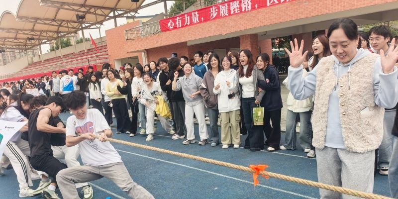 本次趣味运动会设置了“乒乓球传递”“跳长绳”“拔河比赛”“一圈到底”“脱胎换骨”等多个项目。赛场上,趣味与竞技碰撞出别样火花。不少选手因节奏把控不当让乒乓球“溜走”,现场笑声与加油声交织;各队伍通过低声沟通调整节奏,在反复尝试中找到最佳配合方式,充分展现了“不慌不忙、默契配合”的团队风采。最激烈的拔河比赛环节,各队伍紧握长绳、脚蹬地面,啦啦队的加油声此起彼伏,将氛围推向高潮。师生们在奔跑、协作中释放活力,充分展现了团结拼搏、积极向上的精神风貌。