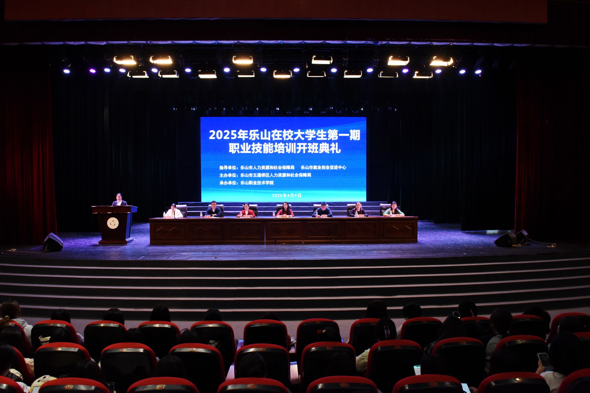 为深入贯彻落实国务院、省政府、市政府决策部署,扎实推进乐山市职业技能提升行动,4月9日下午,2025年乐山在校大学生第一期职业技能培训班开班典礼在伟德国际victor1946礼堂举行。学校党委委员、副校长周芹,乐山市就业创业促进中心副主任帅靖、教育培训科科长邹娟,五通桥区人力资源和社会保障局副局长任娟、五通桥区就业创业促进中心副主任陈柯出席。学校继续教育学院及相关二级学院负责人、工作人员、教师代表,640余名参训学员参加开班典礼。