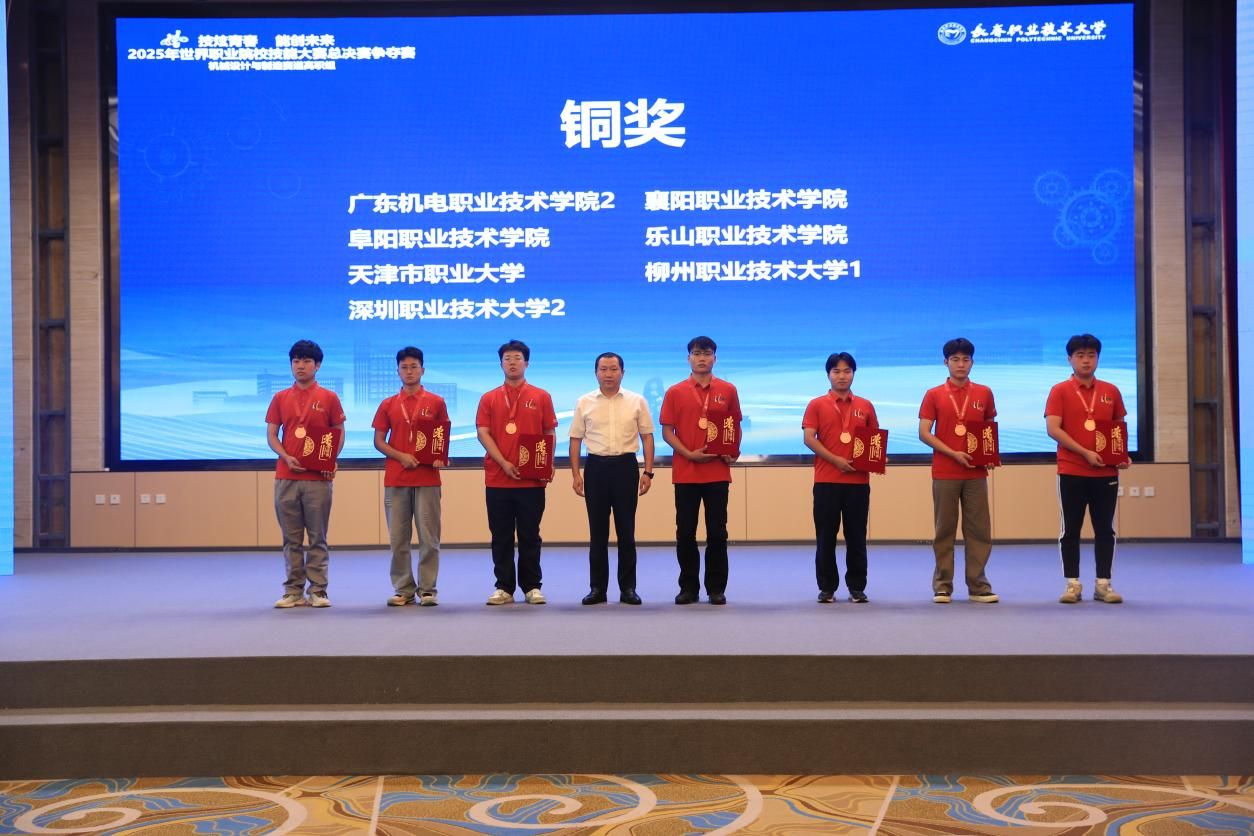 8月31日,2025年世界职业院校技能大赛总决赛争夺赛机械设计与制造赛道(高职组)在长春职业技术大学圆满落幕。本次赛事共吸引来自全国35个赛区的157支参赛团队、574名参赛选手同台竞技。由智能制造学院杨爽、干强华两位老师指导,应文杰、缪佳汛、陈嘉馨三位同学组成的参赛团队夺得铜奖,实现智能制造学院在赛道的新突破。