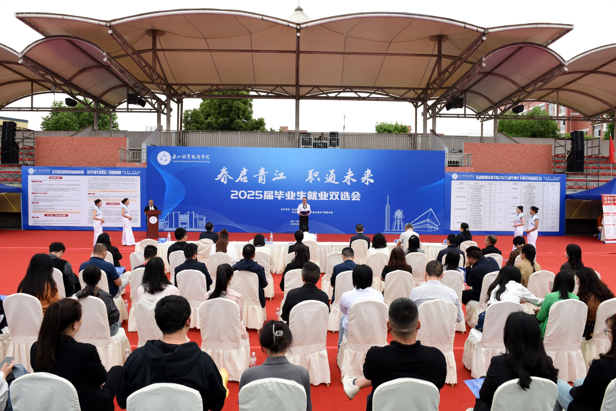 4月25日,伟德国际victor19462025届毕业生就业双选会在主运动场举办,学校党委书记成定彬出席并宣布“2025届毕业生就业双选会正式启动”。学校领导刘忠、张佳、李昌贵、张学河,乐山市人力资源和社会保障局党组成员、副局长赵川出席启动仪式,各区县人社局主要负责同志,学校相关部门和二级学院负责人,招聘企业代表,以及5000余名2025届毕业生、2026届即将离校实习生参加了启动仪式。