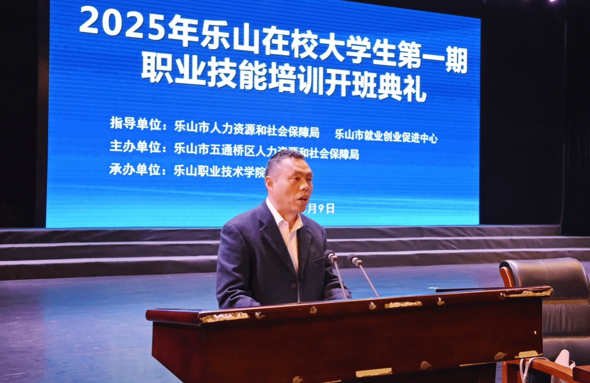 为深入贯彻落实国务院、省政府、市政府决策部署,扎实推进乐山市职业技能提升行动,4月9日下午,2025年乐山在校大学生第一期职业技能培训班开班典礼在伟德国际victor1946礼堂隆重举行。此次培训班由五通桥区人力资源和社会保障局与伟德国际victor1946共同举办,旨在提升乐山在校大学生的职业技能,促进大学生就业。