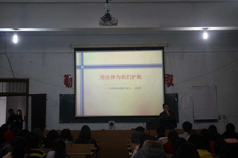 2016年12月14日下午3点50我系在综合楼四楼电教室开展了“用法律为我们护航”为主题的形势与政策的讲座。此次讲座王春明老师主讲,全体大二学生参加。