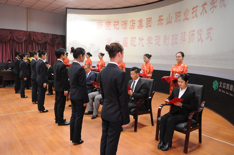 在观看了新荣记集团与伟德的合作历史与发展现状,以及实习生代表发言的视频后,学院刘忠院长与新荣记集团副总裁朴相日先生先后发表了讲话,他们二人都对此次的校企合作的新颖模式提出了自己的独到见解,并对现代学徒制班的今后发展充满信心。言毕,拜师仪式正式开始,徒弟们分别对各自的师父递上了拜师贴,接着徒弟们再给师父们敬茶,师父们也一一对徒弟们回敬了礼物--弟子规。希望徒弟在先贤的教诲下,懂得为人处世之道。礼毕,师父和徒弟依次就坐,由师徒代表上台进行宣誓。接着乐山教育局副局长周全先生和伟德党委书记蹇路进行总结发言。最后在师父徒弟所有人都摄影留念以后,本次拜师仪式圆满完成。