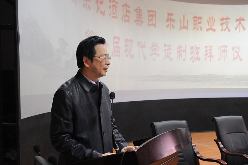 2016年11月16日上午十点,在伟德3D实训室圆满举办了第一届现代学徒制班拜师仪式。出席本次拜师大会的有乐山市教育局副局长周泉先生、教育局职成教科科长姜杰先生、学院党委书记蹇路先生、院长刘忠先生、新荣记集团副总裁朴相日先生和他旗下的精英们,学院教务处、发展规划处、宣传部、人事处、招生就业处、学工部和旅游系的各位领导以及首届现代学徒制班的全体学生。