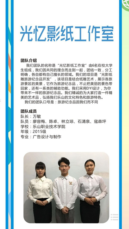 本次大赛历时一个多月,吸引了乐山各高校和社会成员总计160多支队伍参加比赛,通过初赛进30强,复赛进15强,产生晋级决赛9强,每个团队,表现自我,突破自我,秀出了自己的真实水平。其中我系有两支团队参加比赛,分别是张雷、马世新老师指导的《3D旅游科技漫游》团队和由黎芳、张瑶老师指导的《光影纸雕旅游纪念品开发》团队。3D旅游科技漫游项目是以旅客在旅游的过程中亲身体验现代高科技为目的,以水晶内雕为主体,创造出了属于我们自己全世界独一无二又具有实用性的旅游产品,这个高端大气,包装新颖的产品荣获本次大赛季军。光影纸雕团队的产品是纸与光与影完美结合了乐山、峨眉山本地特色且具有创新及适用性强、节能环保集于一体的艺术品,该产品用户年龄限制小,发展前景好,最终也获得了最佳创业团队的优异成绩。