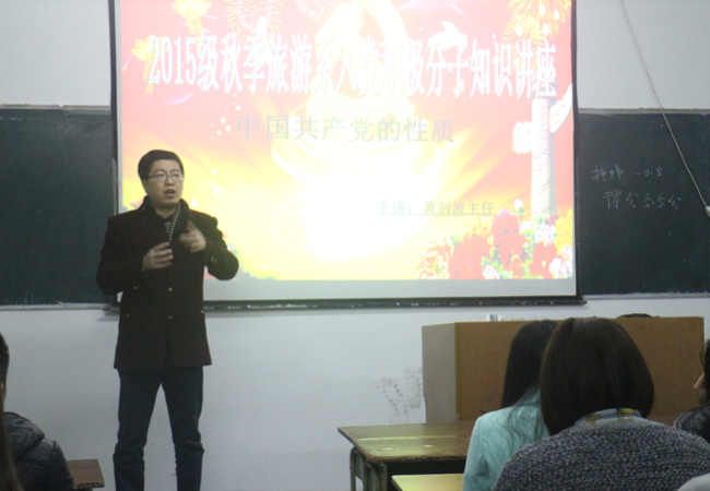 为加强同学们的思想道德建设,提高同学们的政治素养,旅游系于2015年11月29日在多媒体教室开展了旅游系秋季入党积极分子培训第二课,由黄剑波主任主讲,旅游系三十余名入党积极分子参加培训。