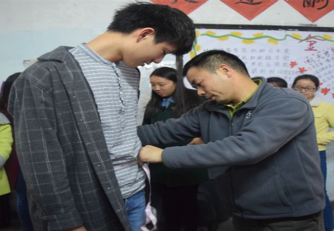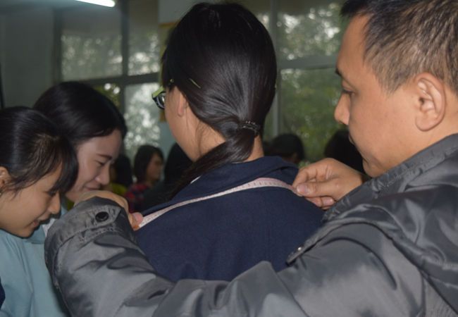 量身定做职业套装,主要的测量内容有袖长、领口、三围、裙长、裤长、肩宽等。两位裁缝师傅十分用心地为每一位同学精心测量,以确保做出来的服装能够合身。