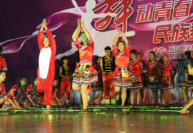 为丰富大学生的课余生活,弘扬中华文化 。由财经系承办的学院于2015年11月25日晚七点在新村校区举办了第十二届大学生艺术节---“舞动青春”民族舞大赛。这次活动很荣幸的邀请到以下重量级评委。他们是国家级一级舞蹈编导、乐山市舞蹈家协会主席熊永辉,舞蹈家协会会员、乐山市舞协副秘书长王妮女士,四川省舞蹈家协会会员、乐山市舞协理事刘华岭女士。到场的还有学院学工部部长、团委书记叶宏光,学院学工部副部长,团委副书记魏凡、罗建玮,旅游系党总支书记:李忠东,旅游系副主任黄剑波,以及各系部领导、老师和学生前来观看比赛。