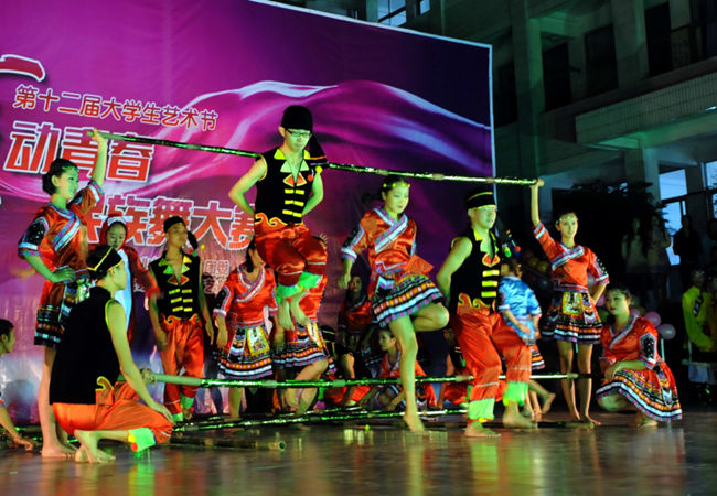舞台上灯光璀璨,比赛现场充满了民族风情的味道,各式各样的民族服装为现场营造了民族气氛。十个参赛团队依次登场,伴随着音乐的旋律他们在舞台上翩翩起舞,宛若一个个活泼的精灵,他们的舞姿或曼妙飘逸或轻巧灵动,从不同的角度与层面演绎了舞蹈的美妙意蕴。有彝族舞、蒙古舞、朝鲜舞等不同类型的舞蹈,旅游系各位同学用肢体的律动向我们展示着苗族的美妙风情,一支“幸福苗寨”点燃了全场的热情,旅游系同学们用竹竿等道具搭配民族服装将大家带到了苗族晚会现场,构建了一幅人与自然和谐相处的画面,现场观众打开了手机手电筒进行摇摆与台上幸福苗寨形成完美的一幅动态画面,传达了给大家带来了视觉上的盛宴,感受到了苗族的异域风情。荣获了学院三等奖,这是他们付出汗水与精力收获的成果。