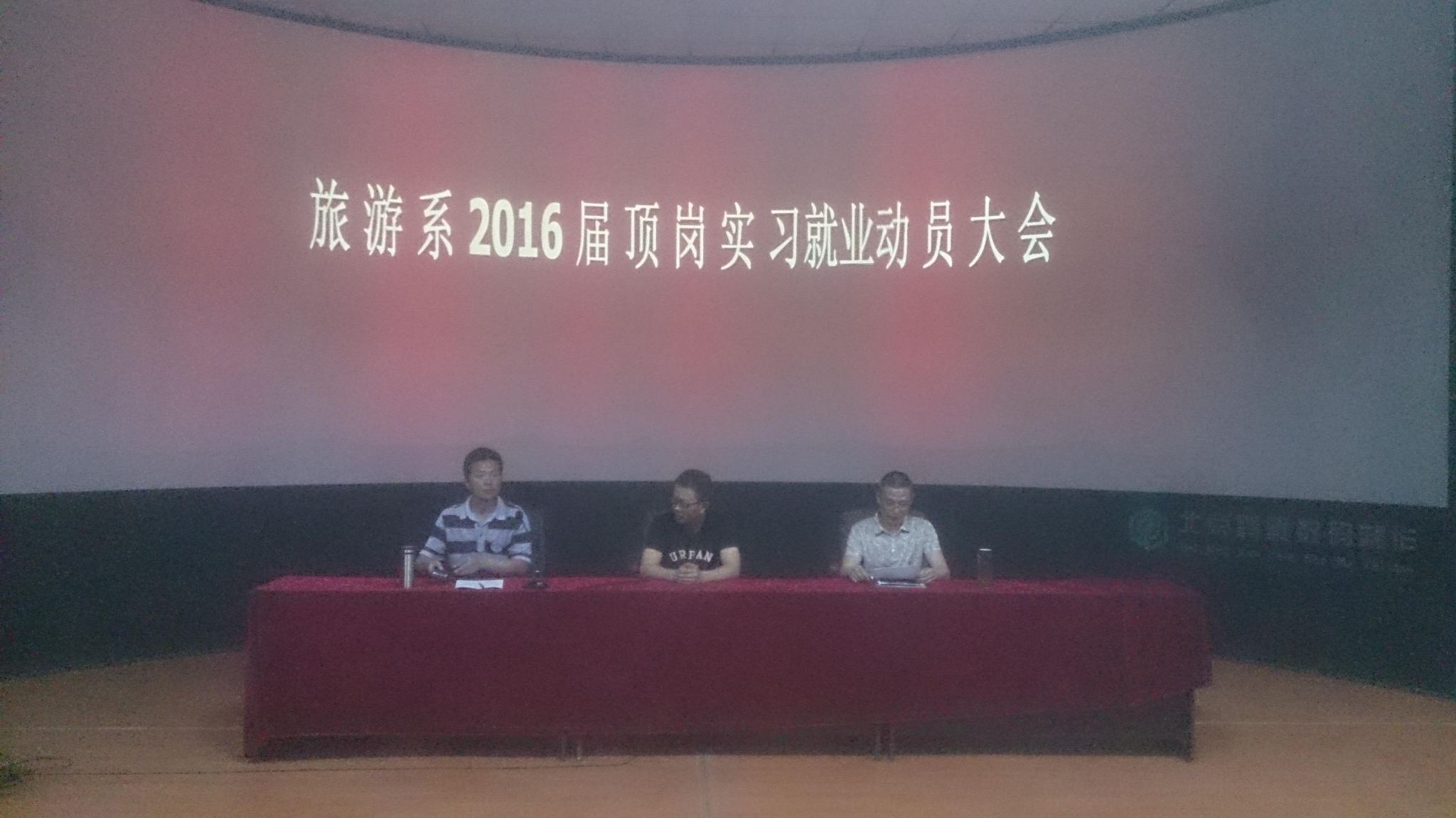 6月3日下午,旅游系在动员3D实训室召开2016届毕业生顶岗实习生动员大会,系总支书记李忠东、副主任何加健、副主任黄剑波、教研室主任、专业主任、顶岗实习班辅导员、顶岗实习生参加了动员大会,会议何加健主持。