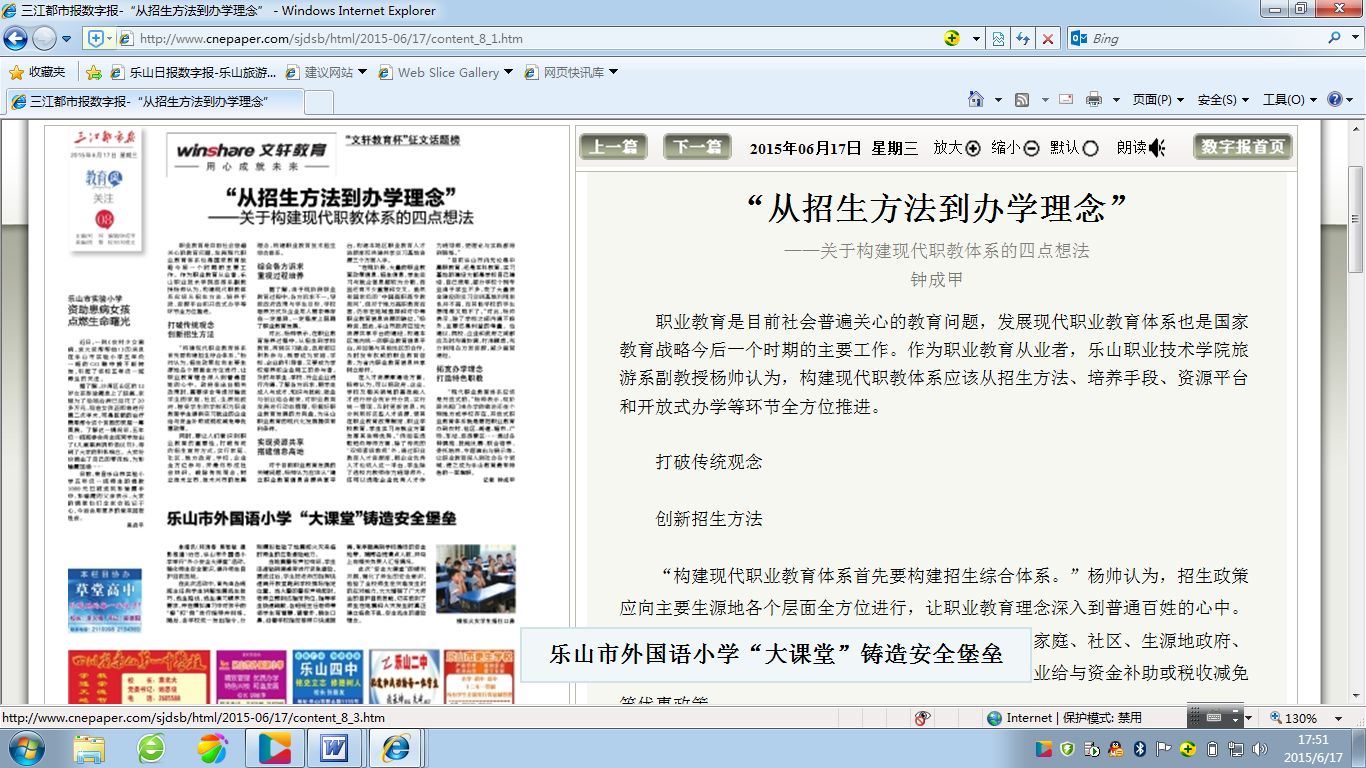 2015年6月17日,乐山《三江都市报》数字报和四川新闻网乐山频道全文转载了我院旅游系教师杨帅关于构建乐山现代职业教育体系的文章。该文章认为,职业教育是目前社会普遍关心的教育问题,发展现代职业教育体系也是国家教育战略今后一个时期的主要工作。构建现代职教体系应该从招生方法、培养手段、资源平台和开放式办学等环节全方位推进。
