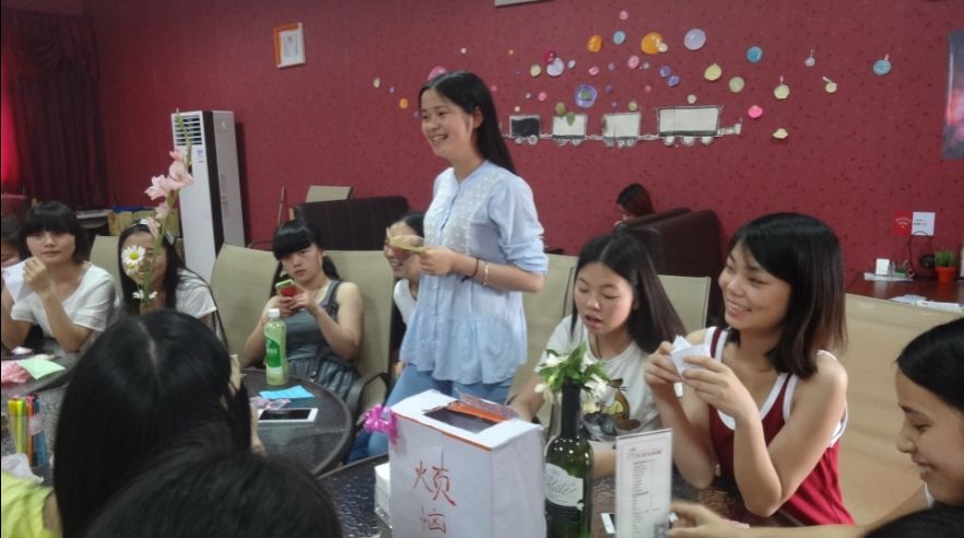 为了唤起同学对心理方面的重视,帮助同学解决心理问题、营造健康、向上的心理氛围。5月18日下午六点,心理协会在旅游系午后休闲吧开展了“丢掉烦恼,快乐成长”活动。