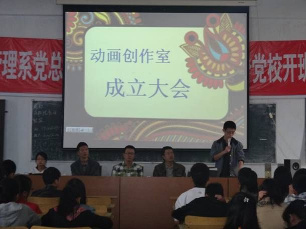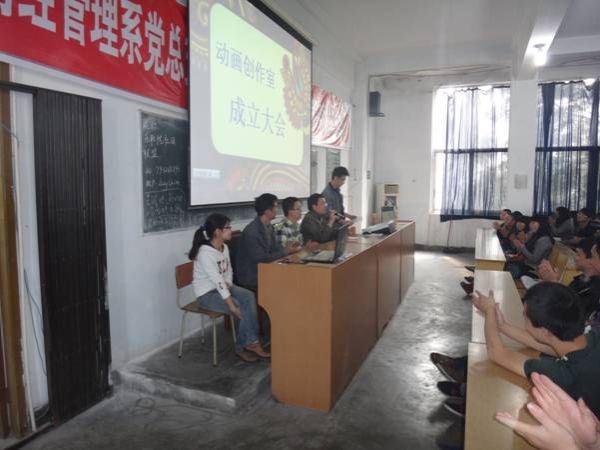 2012年10月26日中午13:00,旅游系召开了动画创作室成立大会,旅游系李忠东书记、何加健副主任、黄剑波副主任以及龚静老师、张雷老师参加了成立大会。