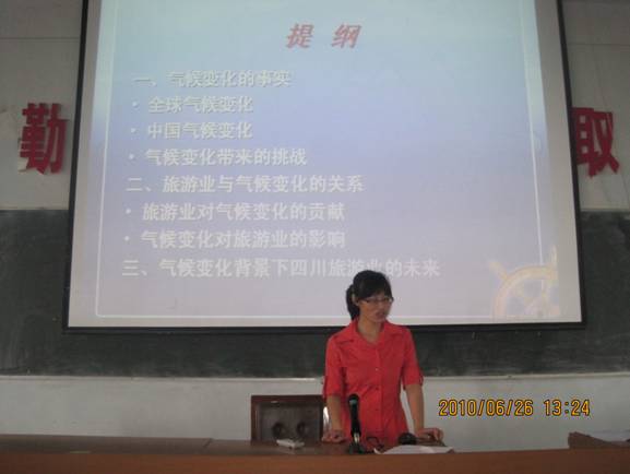 本次讲座由中国科学院成都山地自然灾害与环境研究所的郭剑英博士主讲。郭博士分别从气候变化的事实﹑旅游业气候变化的关系和气候变化背景下四川旅游业的未来三个方面进行了讲解,并对气候变化下的四川旅游业所存在的风险提出了良好的对策,如:加强观察与研究﹑景区实施绿色管理﹑节能减排﹑绿色交通﹑多样化旅游产品等等。最后,郭博士希望我们能够看清楚气候变化对自身的影响,共同应对气候变化对整个旅游行业所带来的一系列的风险与机遇。