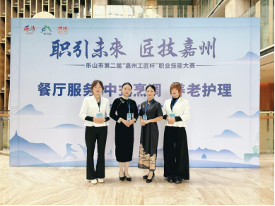 经过认真备赛,在赵太萍与刘梦媛老师的指导下,蔡雅馨的《佛光云海·嘉州禅韵——康养疗愈中老年团养生晚宴》中餐主题宴会摆台与服务荣获餐厅服务赛项一等奖,唐琳的《嘉州叶语·竹韵茶香——商务交流宴会》中餐主题宴会摆台与服务荣获餐厅服务赛项三等奖。