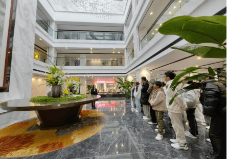 为使课堂理论与行业实践深度融合,在第11-13教学周期间,结合教学计划进度,文化旅游学院酒店25-1、25-2两个班级的学生,在李奥萌和赵太萍老师的带领下,开展“行走的课堂”教学参观活动。师生们依次探访了禅意度假酒店、锦江嘉州宾馆与校内实训基地,在行走中感知酒店业的多元形态。