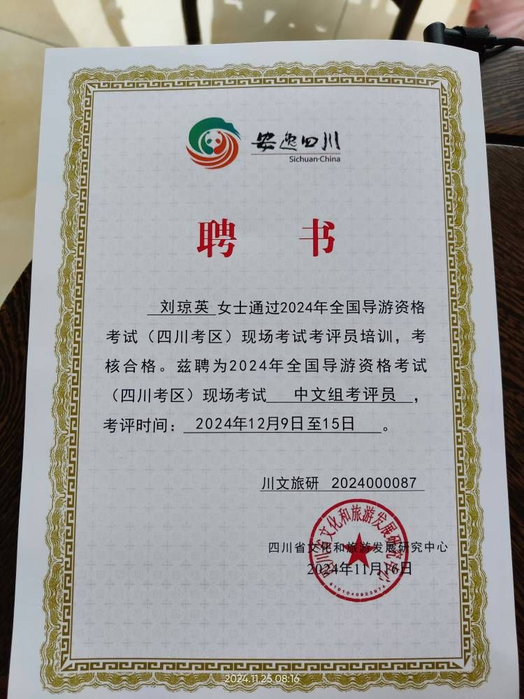 2024年全国导游资格考试(四川考区)现场考试评阅卷工作于2024年12月9日-15日在成都举行。考评员名单是在符合要求的考评员库中随机抽取的。文化旅游学院教师刘琼英、周文英参加了此次评阅卷工作。两位老师严格按照考评流程、考评标准认真评卷、阅卷,高标准、高质量、高水平地完成了考评工作。