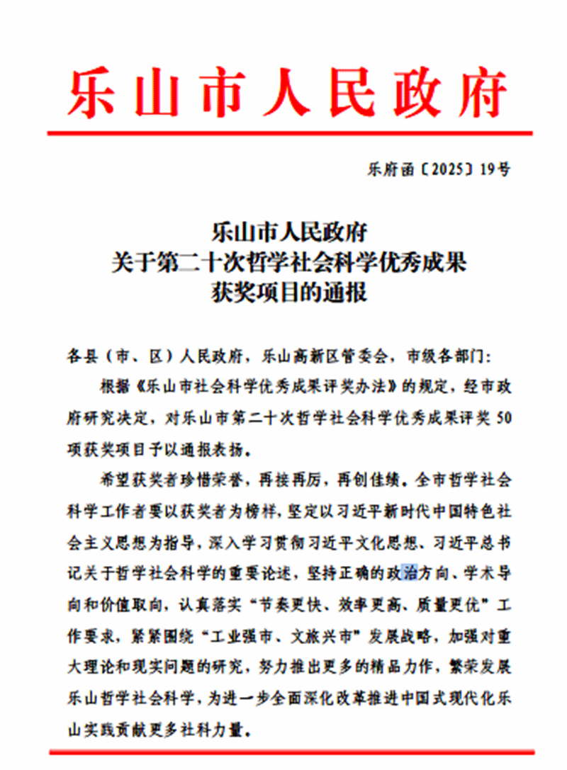 2025年2月,乐山市人民政府发布《关于第二十次哲学社会科学优秀成果获奖项目的通报》,马克思主义学院青年教师刘晓锐的系列论文《非物质文化遗产传承与利用研究》荣获乐山市第二十次哲学社会科学项目优秀成果三等奖。