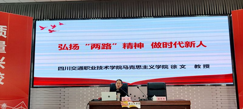 徐文教授以《弘扬“两路”精神做时代新人》为题,从“两路”精神的形成背景、“两路”精神的科学内涵、“两路”精神的时代价值三个维度,用详实的案例分享了十八军进藏和修建川藏公路、青藏公路的感人故事,生动讲述了“两路”变迁对藏区人民带来的巨大福祉和推动四川交通变化的重大意义,结合习近平总书记关于“两路”建设重要指示精神,系统地阐释了“两路”精神科学内涵,并号召青年学生要在新时代、新征程中继续弘扬“一不怕苦、二不怕死,顽强拼搏、甘当路石,军民一家、民族团结”的精神,刻苦学习,提升技能,为中国式现代化贡献自己的力量。