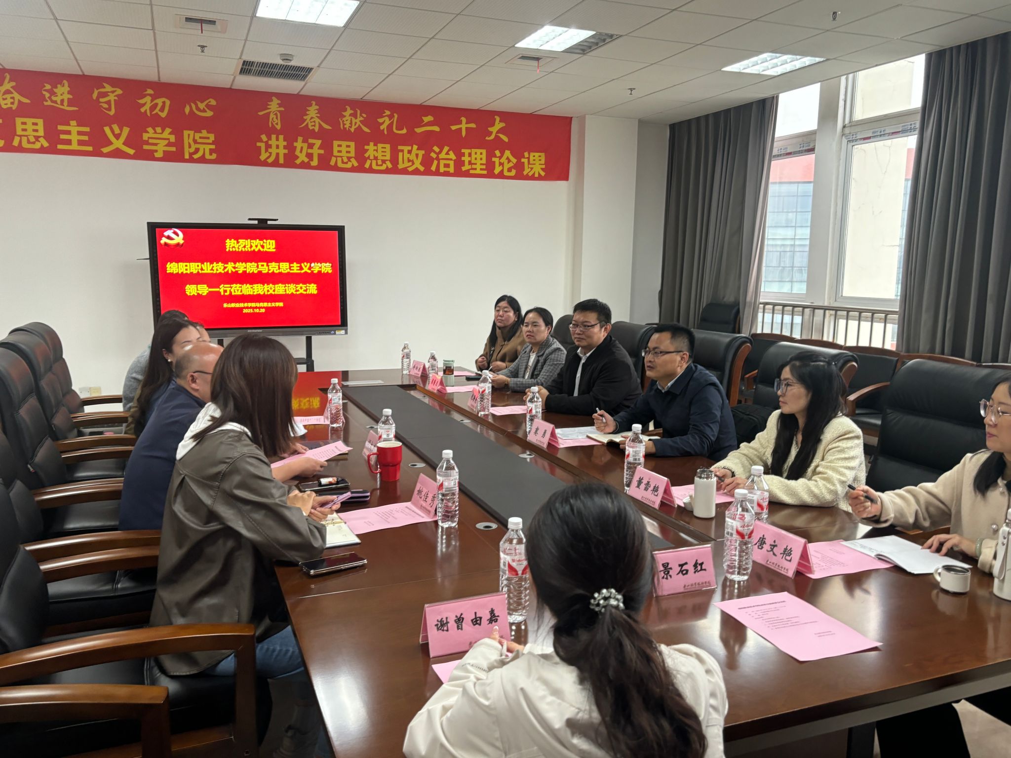 10月20日下午,绵阳职业技术学院马克思主义学院党总支书记、院长蹇勇一行8人莅临伟德马院座谈交流。座谈会在1号教研楼410会议室举行,马院党总支书记胡文杰、马院副院长(主持行政工作)刘倩、马院副院长姚佳秀、相关教研室主任参加。座谈会由胡文杰主持。