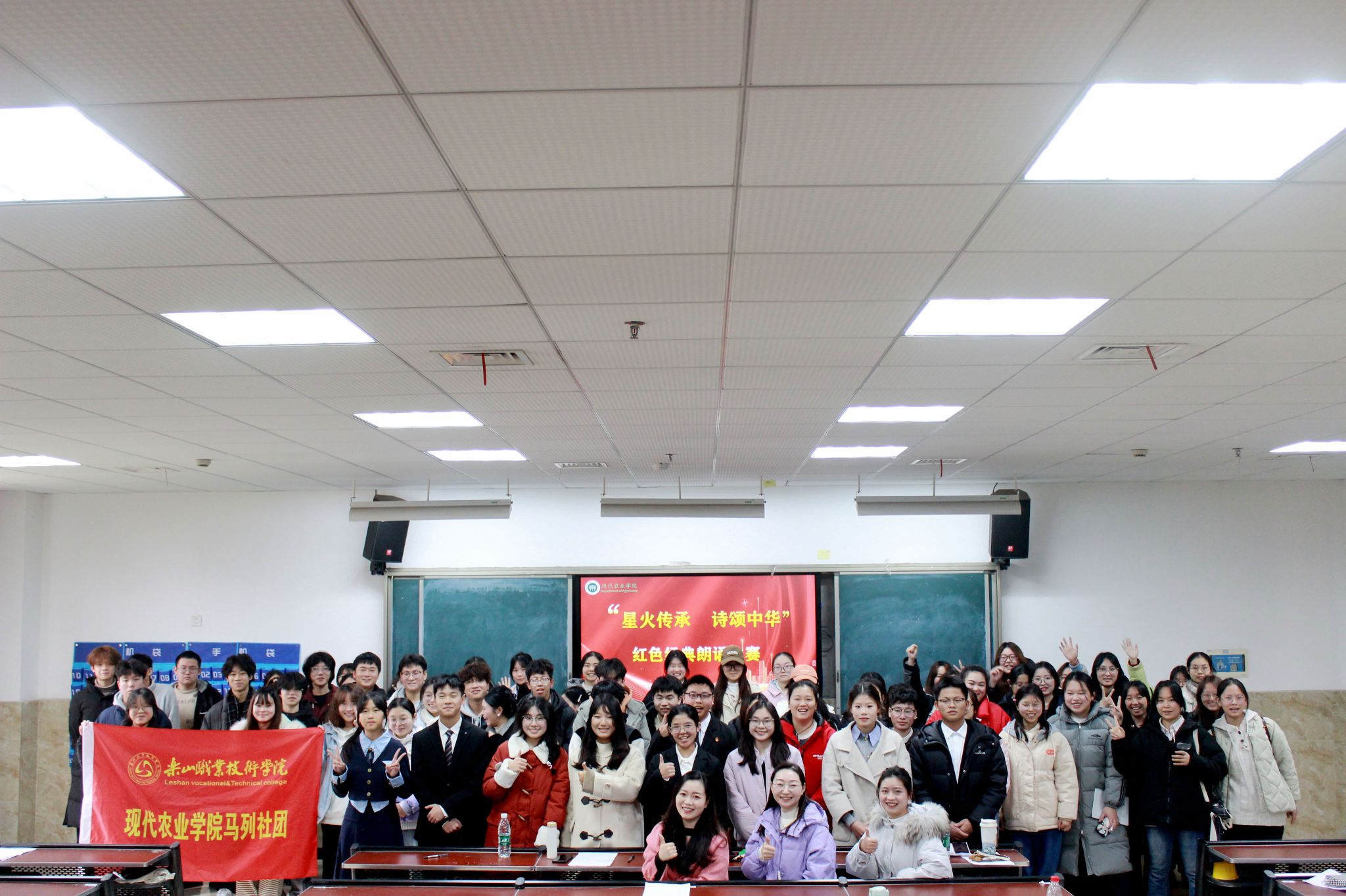 为激发学生爱国热情,传承和弘扬革命先辈的革命精神,现代农业学院马列社团于2024年12月18日下午在教学楼2C102开展“星火传承 诗颂中华”红色经典朗诵比赛。本次活动由马克思主义学院主办,现代农业学院马列社团承办,出席本次活动的有马克思主义学院副院长兼校团委副书记刘倩、马克思主义学院思政教师吴维燕、现代农业学院马列社团指导老师车芸芸及现代农业学院学生共计80余人。
