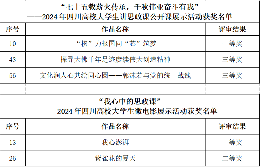 近日,四川省教育工委公布了“2024年四川高校大学生讲思政课公开课展示活动”和“2024年四川高校大学生微电影展示活动”获奖名单。由马克思主义学院指导并报送的5项作品取得佳绩,分别获得四川省一等奖2项、二等奖1项、三等奖2项。其中,《我心澎湃》和《“核”力报国同“芯”筑梦》被推送至国赛评选,经过激烈角逐,《我心澎湃》获全国一等奖,《“核”力报国同“芯”筑梦》获全国二等奖。