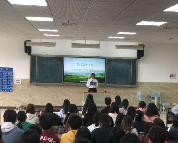 为了进一步加强我院团委、学生会队伍建设,充分发挥主席团的自主职能,培养新一批的学生干部,现代农业学院于2023年5月22日12:30在教学楼2c301召开现代农业学院学生干部换届竞选会。担任本次活动的评委有现代农业学院副书记、副院长(主持工作)鲜凌瑾,现代农业学院专职副书记宋建群,现代农业学院学生管理教师祝磊以及现任学生干部主席团成员和各部门部长。经过个人报名、资格审查、技能测试等多重筛选,朱健琳、喻垚雲、雷兴宇、萧依函共4名现代农业学院22级同学参加本次现场竞选,70余名现代农业学院学生代表参与观摩。