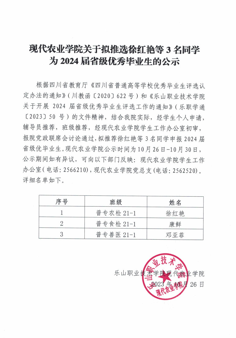 现代农业学院关于拟推选徐红艳等 3名同学为2024届省级优秀毕业生的公示