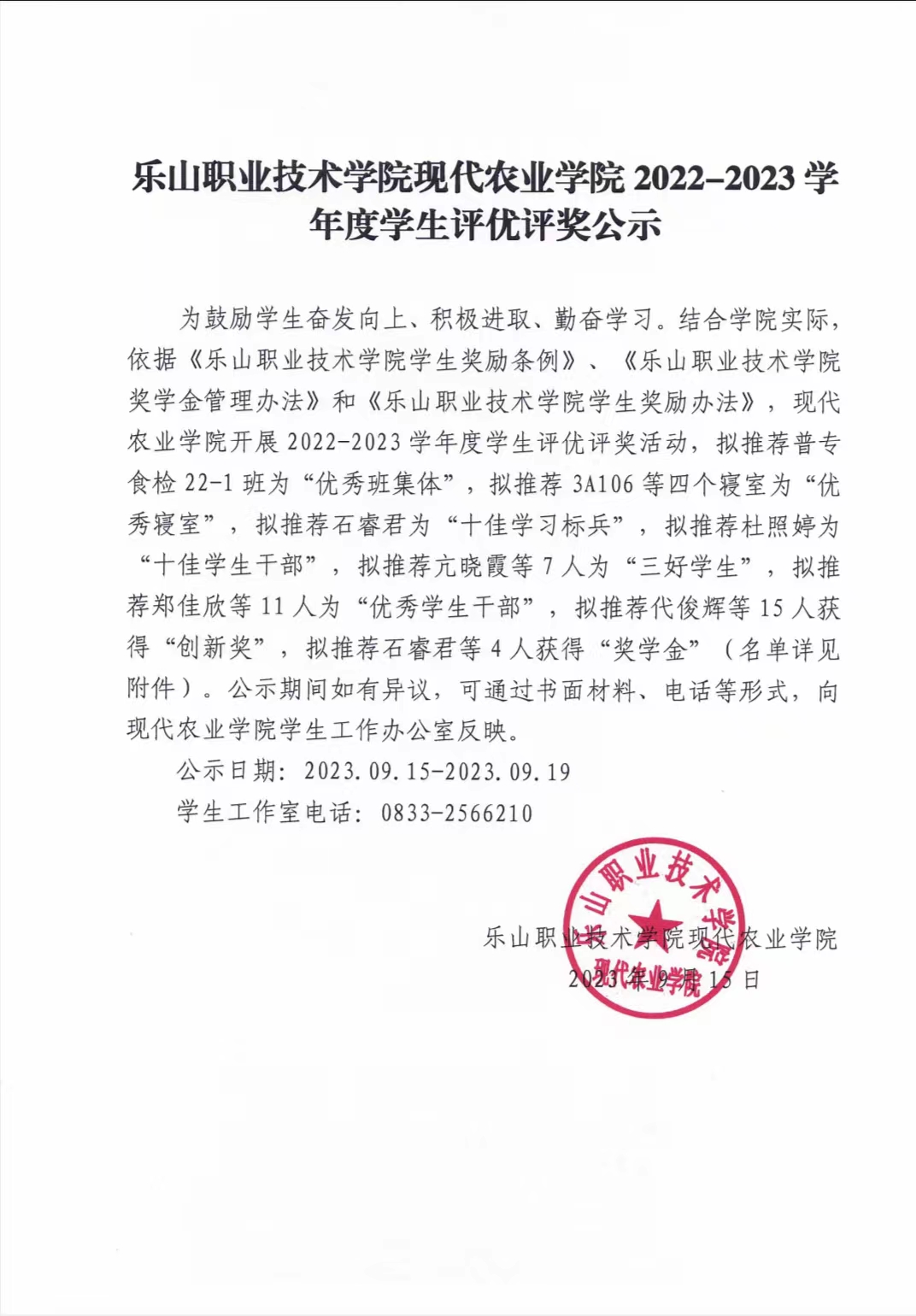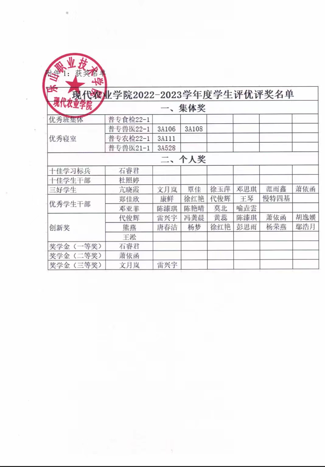 伟德国际victor1946现代农业学院2022-2023 学年度学生评优评奖公示