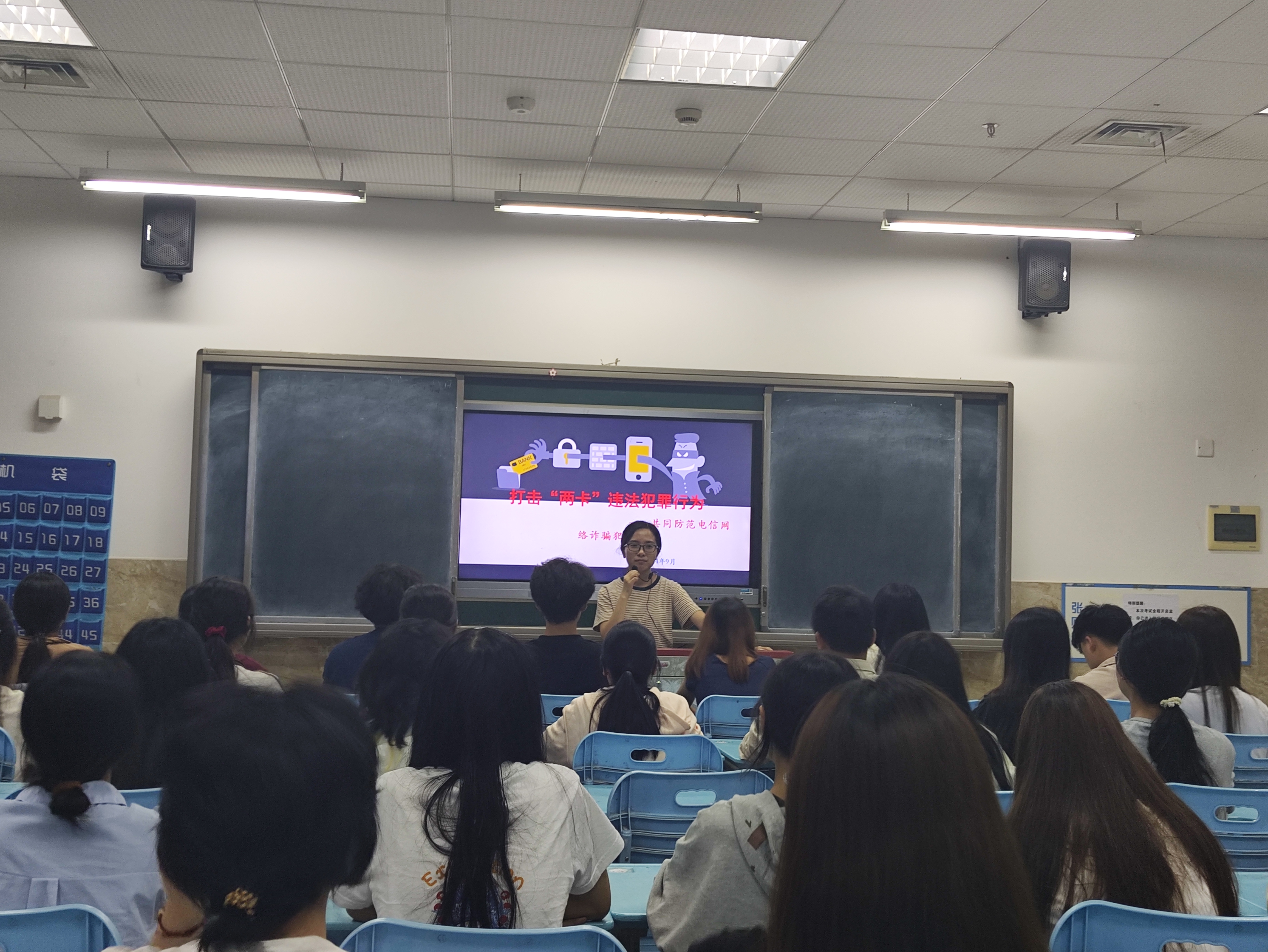 在班会上,辅导员首先着重强调了打击“两卡”违法犯罪行为,向同学们介绍了各种诈骗手法、打击诈骗的重要性和如何防诈骗。随后,辅导员就国庆假期的时间安排和寝室的各项安全工作进行讲解和部署,与此同时辅导员还提醒同学们离校留校申请和人身安全。