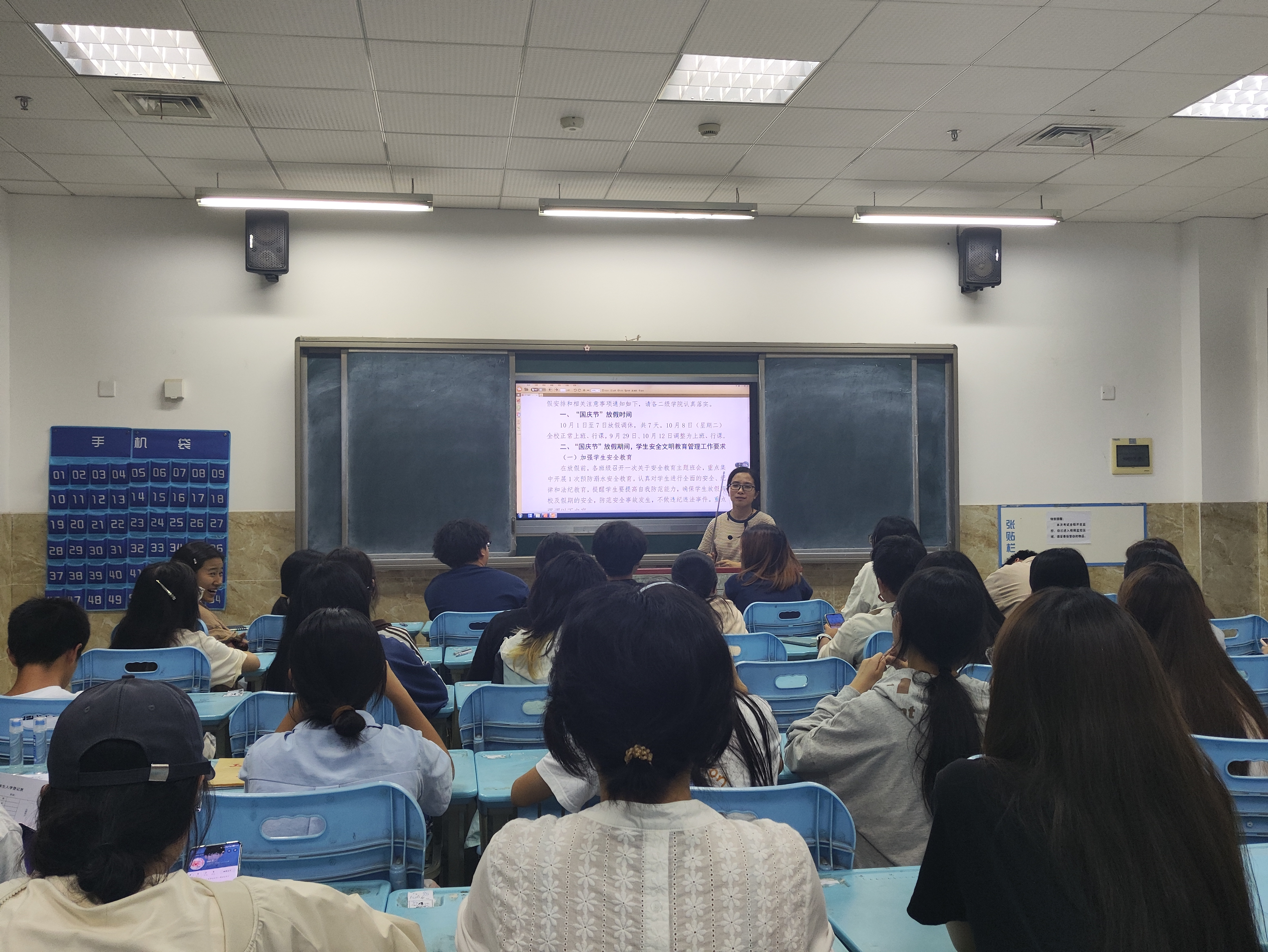 “金秋送爽,举国欢腾,国庆节翩然而至,共祝祖国河山锦绣,岁月安澜”为了确保同学们在国庆假期的安全,现代农业学院于9月29日晚上在1号教学楼开展国庆假期安全主题班会,现代农业全体辅导员和全体学生参与。