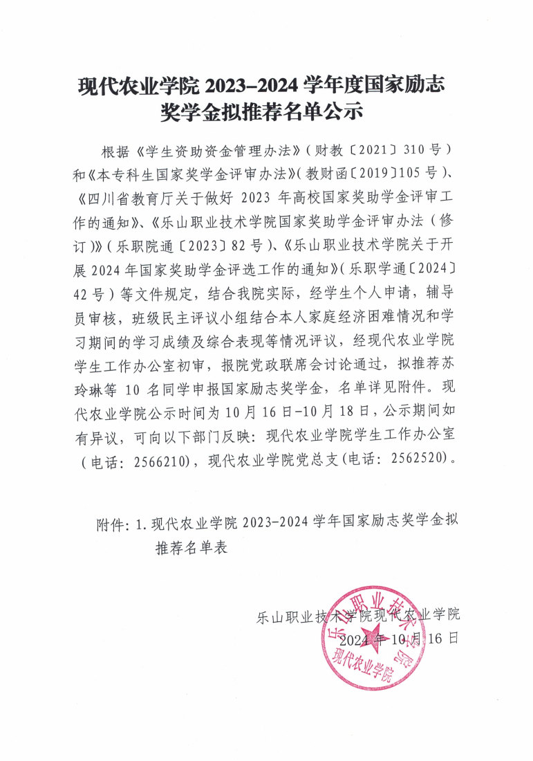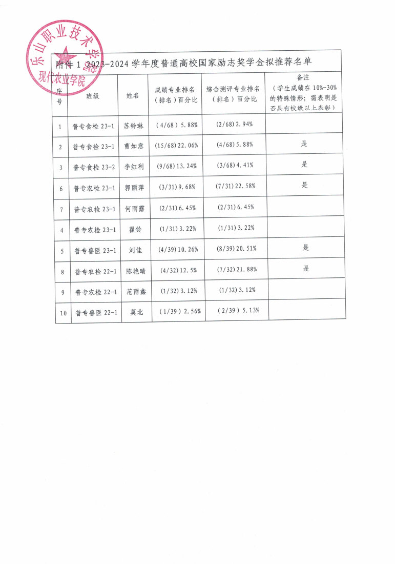 现代农业学院2023-2024学年度国家励志奖学金拟推荐名单公示