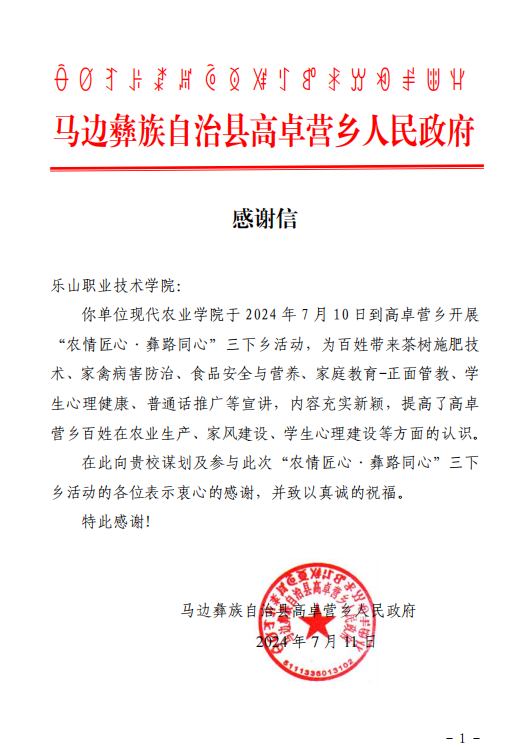 为进一步推进文化科技卫生“三下乡”,提高彝族地区语言文字的规范化和标准化水平,增强民族凝聚力,助力乡村振兴,现代农业学院“农情匠心 ‘彝’路同行”社会实践团队走进乡村、走进家庭,于2024年7月10日赴乐山马边彝族自治县烟峰镇、高卓营乡开展“乡村振兴 ‘彝’路同行”社会实践活动。党总支副书记宋建群、学生管理干事祝磊、分团委书记汤秀娟带领团队学生参加了此次活动。