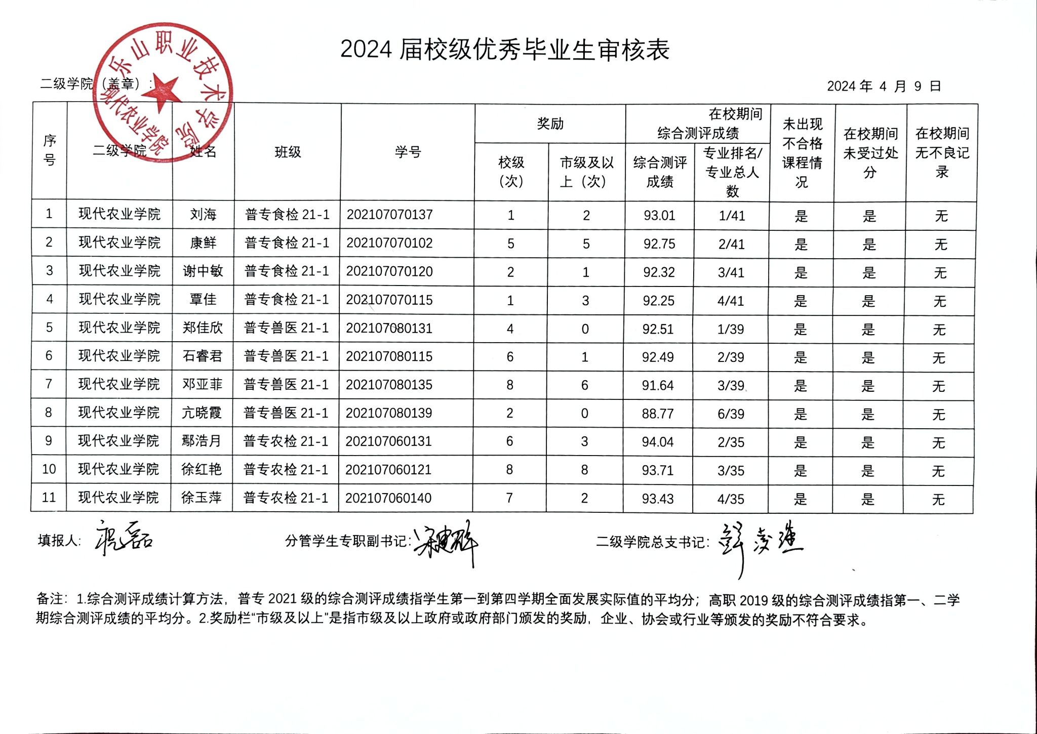 现代农业学院关于拟推选刘海等11名同学为2024届校级优秀毕业生的公示