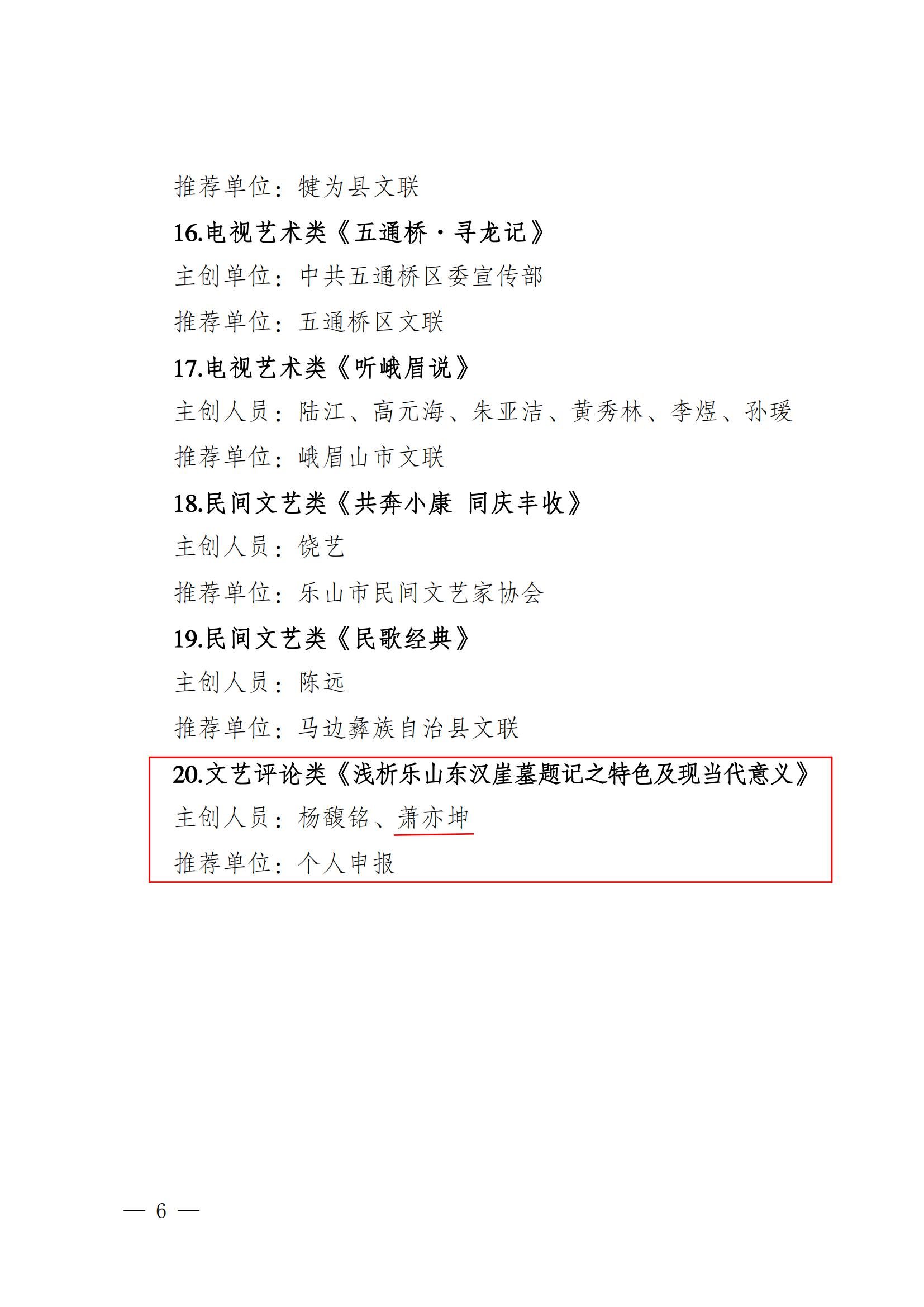今年 2 月,乐山市文联启动了 2024 年度“20 佳推优”工程申报评选工作,经初审、终审,并结合公示收集到的意见建议,市文联主席团研究决定,评选出“特别项”作品 7 件、“入选项”作品 20 件,组织工作突出单位 10 个。伟德国际victor1946素质教育学院美育教研室教师萧亦坤的文艺评论《浅析乐山东汉崖墓题记之特色及现当代意义》入选2024 年度“20 佳推优”工程“入选项”。