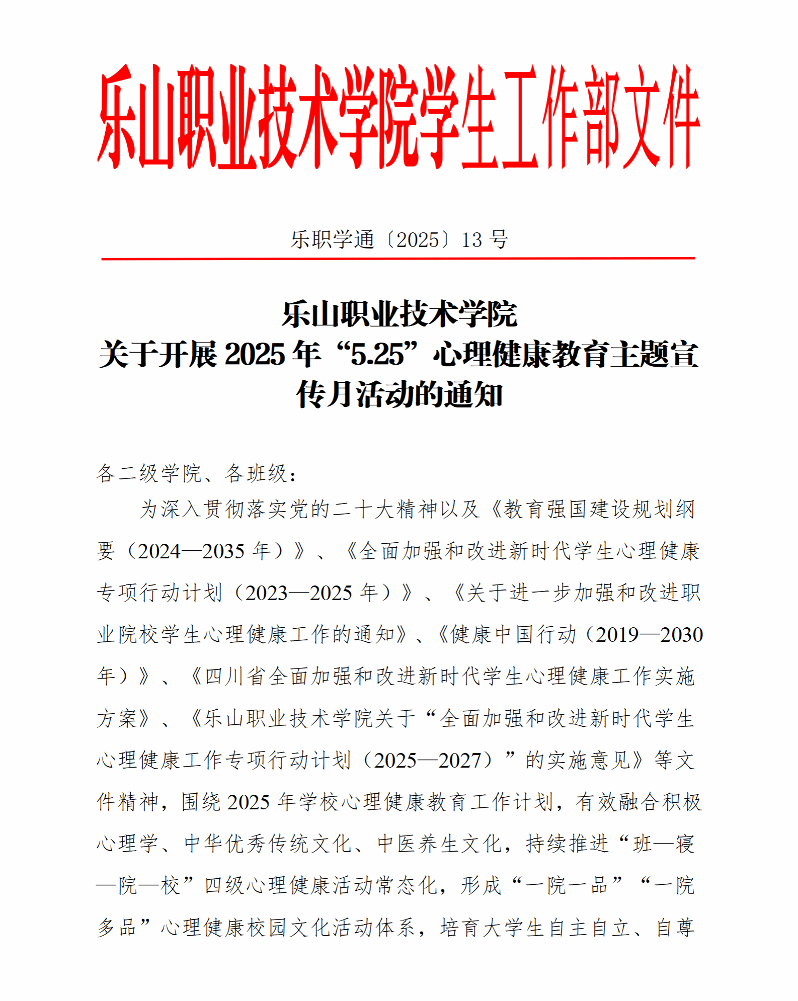 为深入贯彻落实党的二十大精神以及《教育强国建设规划纲要(2024—2035年)》、《全面加强和改进新时代学生心理健康专项行动计划(2023—2025年)》、《关于进一步加强和改进职业院校学生心理健康工作的通知》、《健康中国行动(2019—2030年)》、《四川省全面加强和改进新时代学生心理健康工作实施方案》、《伟德国际victor1946关于“全面加强和改进新时代学生心理健康工作专项行动计划(2025—2027)”的实施意见》等文件精神,围绕2025年学校心理健康教育工作计划,有效融合积极心理学、中华优秀传统文化、中医养生文化,持续推进“班—寝—院—校”四级心理健康活动常态化,形成“一院一品”“一院多品”心理健康校园文化活动体系,培育大学生自主自立、自尊自信的积极心理品质。学生工作部决定将在4月—6月期间开展以“青衿致远,百脉生春”为主题的5.25心理健康教育宣传月系列活动。现将相关安排通知如下: