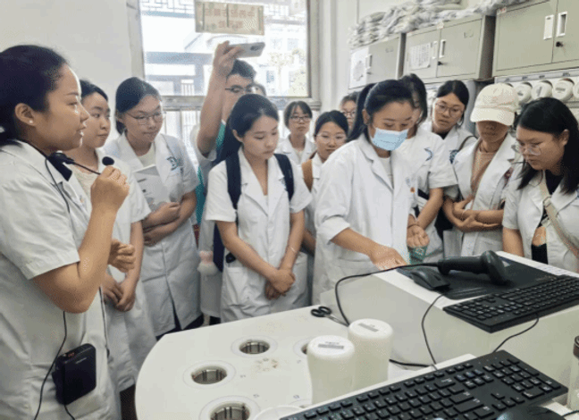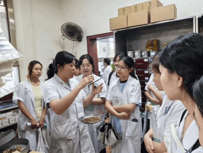 本次实践教学精心设计为两大环节,旨在为学生提供沉浸式的学习体验。环节一:门诊中药房实地参观学习。在医院带教老师邓春洪、吴瑛的引导下,学生们分组深入门诊中药房各功能区。老师们对配方颗粒、小包装饮片、院内制剂、普通饮片以及中成药陈列等区域进行了系统而详尽的讲解,使学生们直观了解了不同类型中药的储存、管理与调配特点。同时,老师们现场演示了配方颗粒和传统中药饮片的规范调配流程,并重点剖析了中成药调配的关键步骤及严格执行“四查十对”制度的重要性。讲解过程中,师生互动热烈,带教老师不时抛出问题启发思考,并为回答正确的同学特别赠送了该院特色制剂——解毒止痒膏,极大地激发了学生的学习热情。