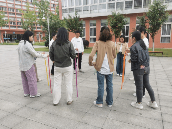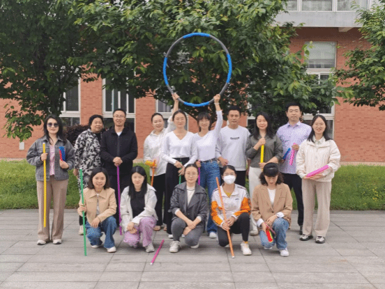 活动现场,教职工分为两个小组,两组教职工热情高涨,迅速投入到“珠行万里”“不倒森林”“一圈到底”等趣味项目中。在“珠行万里”环节,大家手持半圆形槽管,接力配合将小球平稳传递至终点。过程中,现场不时传来阵阵紧张的提醒声与加油声,教职工们全神贯注、默契协作,为了团队目标全力以赴。“不倒森林”考验的则是成员间的注意力与协调性,每人手抵一根塑料杆,在规定时间内迅速换位并保持杆不倒。大家屏气凝神,相互配合,失误时一笑而过,成功时击掌庆祝,现场充满了欢声笑语。而“一圈到底”项目中,队员们手拉手围成一圈,仅依靠身体的扭动传递圆环,整个过程既充满挑战又趣味横生,大家在一次次尝试中不断磨合,逐渐找到最佳节奏。两组教职工你追我赶,既展现出激烈的竞争意识,又彰显出团结友爱的精神风貌。