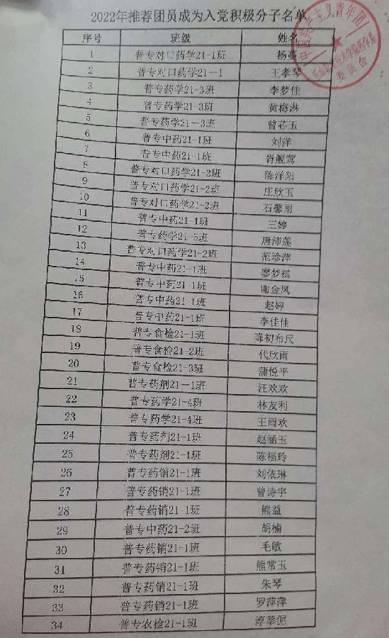 经团支部推荐,系团委审查,拟将药学系杨蔓等34名团员作为团内推优入党积极分子人选向党组织推荐,现公示五天,公示期间有任何意见和情况反映可与监督部门联系。