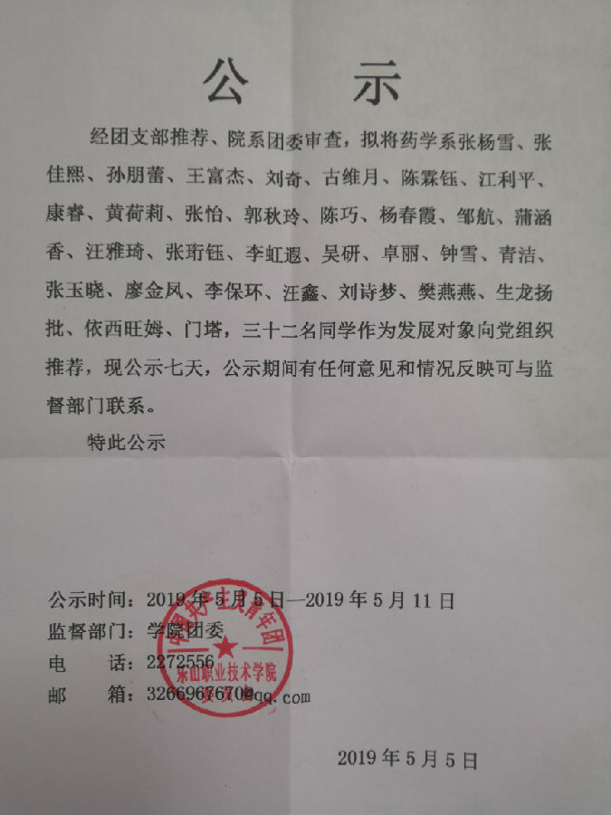 学院团委关于药学系团内推优的公示
