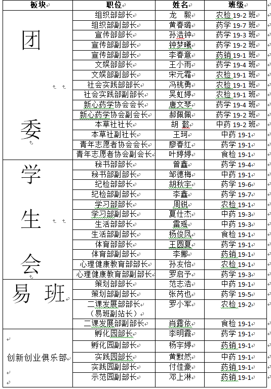 经过个人申请,师生推荐,系部考核和团委会讨论,现将药学系第九届团学易创部门(社团)候选人名单公示如下